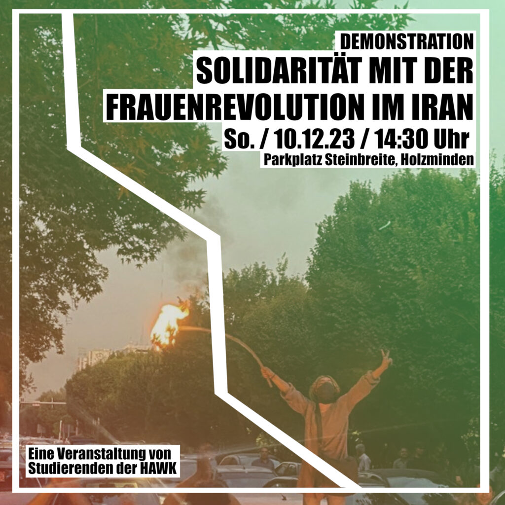 Es freut uns wirklich überaus, dass am Sonntag, den 10.12.2023, im benachbarten Holzminden von 14:30 Uhr bis 15:30 Uhr eine Demonstration in Solidarität mit der Frauenrevolution im Iran stattfinden wird. Startpunkt der Veranstaltung ist der Parkplatz „Steinbreite“.