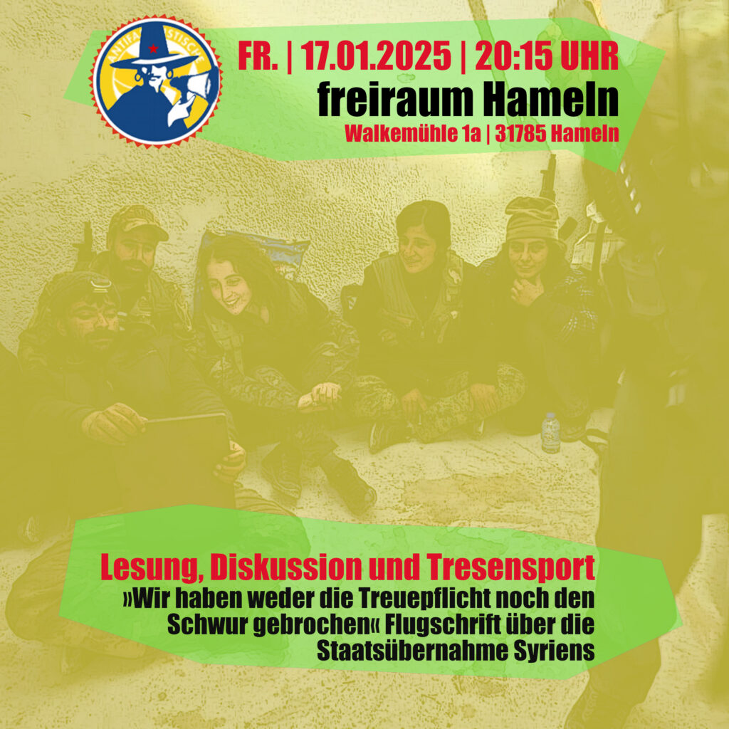 Am Freitag, den 17. Januar 2025, widmet sich das Offene Antifa-Treffen „Club Alerta“ im freiraum Hameln (Walkemühle 1a, 31785 Hameln, www.freiraum-hameln.de) ab 20:15 Uhr den aktuellen Entwicklungen in Syrien. Das finden wir super und empfehlen daher den Besuch dieser Veranstaltung!