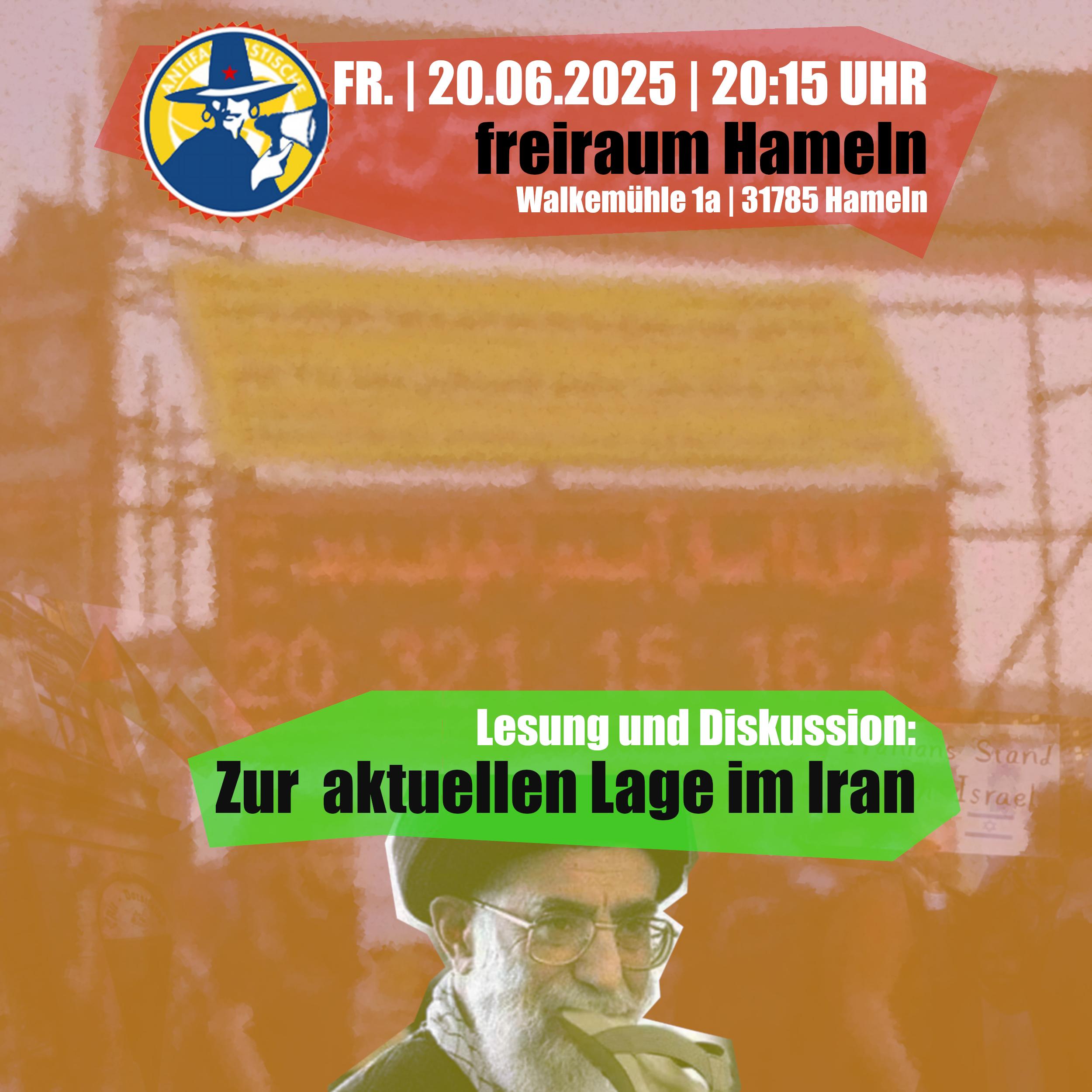 Am Freitag, den 20. Juni 2025, ab 20:15 Uhr widmet sich das Offene Antifa-Treffen „Club Alerta“ im freiraum Hameln (Walkemühle 1a, 31785 Hameln, www.freiraum-hameln.de) der aktuellen Lage im Iran. Hierfür sollen zunächst einige ausgewählte Texte gelesen werden (gerne dürfen auch noch eigene Textvorschläge eingebracht werden), um anschließend darüber ins Gespräch zu kommen. Das finden wir super und empfehlen daher den Besuch dieser Veranstaltung!